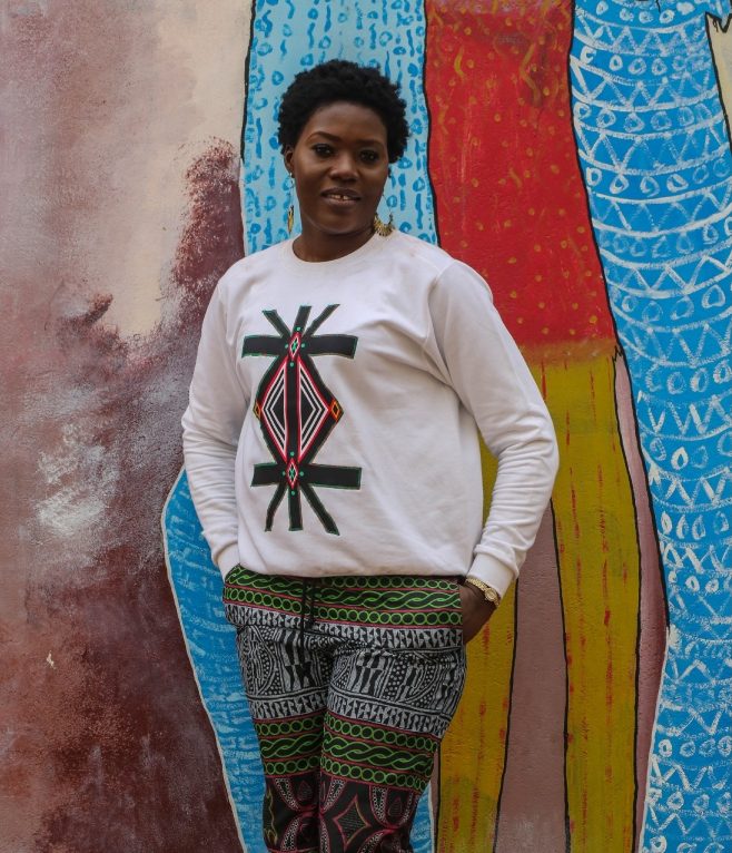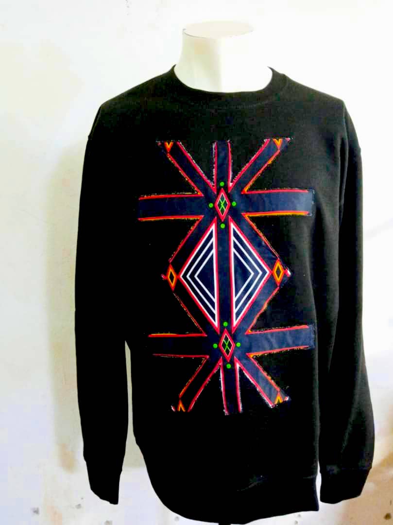 Sweat col rond orné d’un graphisme tribal coloré, symbole universel des éléments de la nature, tissu wax typique du sud ouest Cameroun.